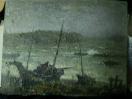 絨毯のような布? を、ベニヤ板に貼りつけ描いたままの状態で、恐らく湿気でベニヤ板の片側が反ってしまったのでしょう、それで布は少し剥がれていて、あまり状態が良いとは言えません。