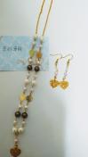 ◆生成/ピンク/高級茶パールの透かしハート付きネックレス&ピアス