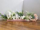 木製のwelcomeの文字に造花を付けたナチュラルイメージのオブジェ&人工芝素材のウサギに蝶ネクタイの新郎ウサギ&人工芝素材のウサギにベールを着けた新婦ウサギのセットです。