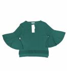 色は暗めのグリーン〓。袖口はドレープが豪華なベルスリーブです〓。肩マワリはコンパクトで途中から袖口にかけて一気に広がったベルスリーブなので、流行りの肩から広がったヒラヒラスリーブより肩幅が強調されません〓。少しボートネック寄りな襟ぐり、裾のライン編み、前より2.5cm長い後丈、と、大人っぽぃデザインになっています〓。