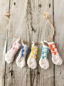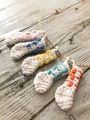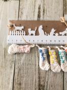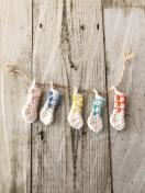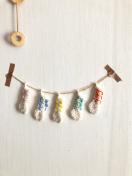 生成りに、カラフルな それぞれ違うカラーの模様の ミニミニ靴下を麻紐にぶら下げてみました♪