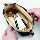 長さのあるメイクブラシがすっきり収納できるオープンポーチ。メイク上級者にはうれしいサイズです。開口部が大きく出し入れしやすい。