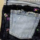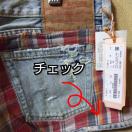 ★カラー/ダメージ加工のデニムに後側黒ベロアに小花刺繍+赤系チェック