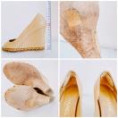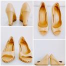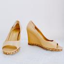 CHANELシャネルゴールドチェーンベージュオープントゥウェッジソールパンプス金色