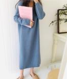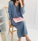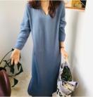 韓国スモーキーブルーグレーくすみ水色ニットミディアムロングワンピースVカットドロップショルダーストレート