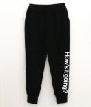黒の楽しいプリント入りスエットパンツ。綿素材ではきやすくロゴがいいね! 何にでも合う便利なアイテム。綿85ポリエステル15