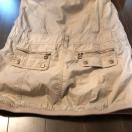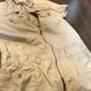 こちらで新品で購入、新品未使用、薄いベージュシャカシャカ素材、ポケットは胸2つ、ウエスト2つ、ヒップ2つ、ファスナーzip2つ付きで上下自由に下げれます、ウエストと裾と袖裾ゴム入り、