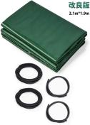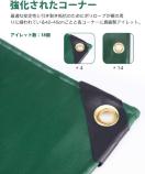 サイズ:2.1x1.9m、厚み:0.46mm、色:グリーン。ハトメ数:18個、ハトメ素材:真鍮。重量:パッケージ全体2.775kg。