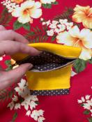 山吹色のフェルトに白レースと茶色のドット生地を合わせて作成致しました。