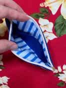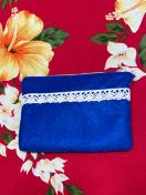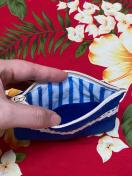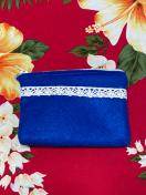 青のフェルト生地にベージュレースとファスナーをつけ、中地に爽やかなストライプのフェルト生地を合わせました☆