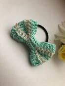 レース糸とコットンミックス糸でリボンを編んで、ヘアゴムを作りました。
