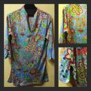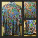 さらさらした素材の、スリット糸(ラメ糸)を使用した、キラキラ光っているエスニック風花柄のチュニックです。袖口や裾はスリットあり。衿元のスリットが、首もとをきれいに見せてくれます。