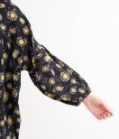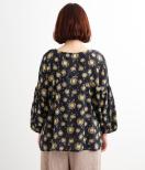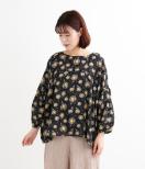 ブラック地にタンポポ柄が 大人可愛い ゆったり切替プルオーバー。ぷっくり袖が可愛らしいシルエットに。