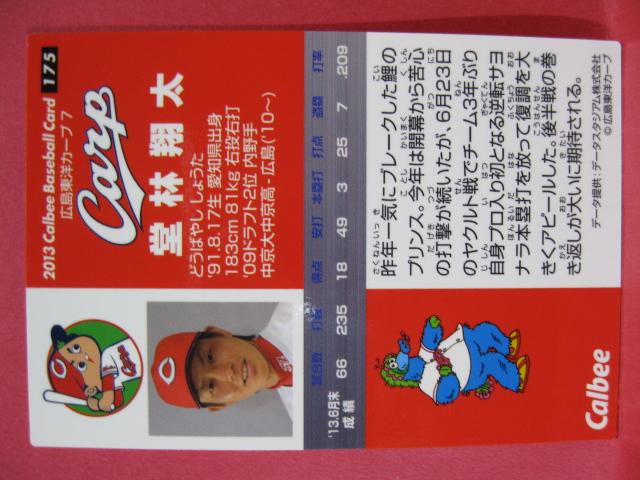 ご覧いただき有難う御座います。自己紹介欄・商品説明をお読みになったうえで、納得がいく方だけ、入札をお願い致します。☆★☆★☆★☆★☆2013カルビーCalbeeベースボールカード 広島東洋カープ 堂林翔太です。未使用品ですが、細かな傷や汚れ等があるかもしれませんので、こだわりのある方は、入札をご遠慮下さい。☆実際の送料は、増減する場合があります(梱包料として+30〜100円程度いただきます)。☆自宅保管の為、状態にこだわる方・神経質な方はご遠慮下さい。☆如何なる場合でも、キャンセル・返金・返品・クレーム等は受け付けません。締切日時