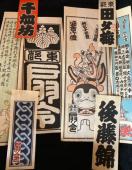 桃太郎、金太郎、浦島太郎の納札です。写真のような納札や千社札は神社仏閣に納品貼付するために江戸時代中期位から作成され始め、最初の頃は手書きだったようですが、木版画に以降したそうです。