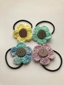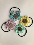 レース糸でお花を編んで、ヘアゴムを作りました。ウッドボタをー付けて可愛く仕上がりました。