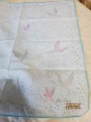 水色に白いお花と淡いピンク系の鳥のハンカチです。