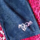 何にでも合うコーディネートしやすいデニム柄のストレッチパンツです。股下48センチ。裾のピンクのハートとスリットがポイント。返品なしのお約束にてよろしくお願いします。締切日時