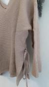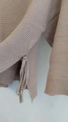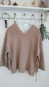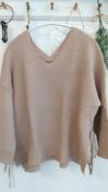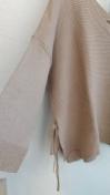 ミルクティーカラーがベージュコーデに使えるニット。サイドの深スリットで中のインナーを変えて雰囲気をいろいろ楽しめます。Vネックが鎖骨を綺麗に見せ、また、サイドのリボンが可愛らしさを表現してくれます。七分袖の丈感は華奢見えを可能に(^-^)シミや汚れありませんがusedにご理解いただける方へ。チェックしておりますが、見落としもないとは言い切れません(T-T)細かいところが気になる方はお見送りくださいませ(。>д<)