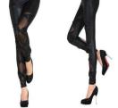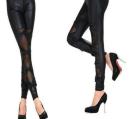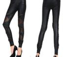 フェイクレザーのレギンスパンツ。フロント部分がリボンを結んだ様な個性的デザイン。