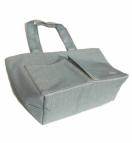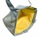 素材は→ポリエステル、でゴワゴワの厚みのあるデニムに見える生地で、内側は黄色いストライプのツルツル裏地です♪。水や汚れに強そぅな素材です。