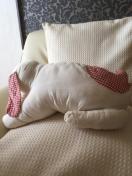 縫い目が均等でない部分あり、手作り感溢れた感じもしますが、背中に頭を乗せて、一緒に寛いで頂けると、ちょっと困り顔のこの犬も喜びます。