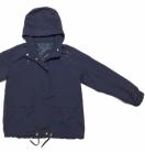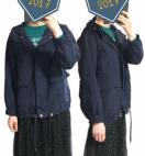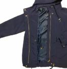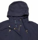 色は、濃紺です♪。ファスナーやスピンドルはゴールドで女性らしさもあります。フード&ウエスト&裾、は紐付きで調整可能。袖口はゴムで、風の入り込みを防ぎます。
