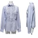胸もとのフリルデザインとドット柄の涼しげなブルーが清潔感があって上品なシャツブラウス。シルエットの美しさと着心地の良さは、イタリアのシャツメーカーならでは!