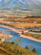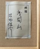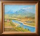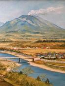 晴天の澄み渡る空の青を基調にした浅間山と麓を流れる河川を描いた作品です。所々に見られる赤い屋根の民家がより画の魅力を引き立たせています。明るく、非常に美しい絵です。