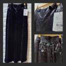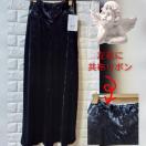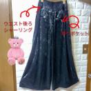 ベロアのかわいいリボンが前ウエスト両サイドに付いています。後ろはシャーリングゴムで、左ファスナー開閉。ポケット両サイドにあり。ハイウエストですので、脚長効果あります。