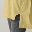 色は、流行りのススケた感じのアースカラーの薄イエローです♪。胸元には白いロゴ。脇線が前に寄った細見え効果。前&後の段差とチビスリット。控えめディテールのみのシンプルデザインです♪。