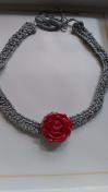 赤カメリア風ハンドメイドネックレス。抗菌ニット使用。赤珊瑚のような光沢です。長さ約23センチ。腕に巻いてブレスレット風にまたブローチ風に、お好きにお使い頂けます。また長さは調節できます。締切日時