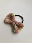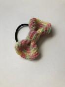 ウール100%の毛糸で丸っこいリボンのヘアゴムを作りました。