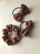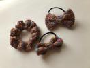 ウール100%の毛糸で、2種類のリボンとシュシュを編み物ました。