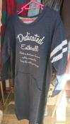 ネイビー色の裏起毛、前に白ロゴ、片腕に白ライン2本、前にはポケット付きの、マキシ丈ワンピースです。