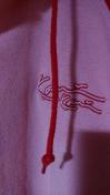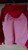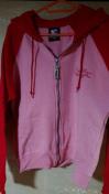 ピンク色と赤の切り替えの、中が起毛で、前ファスナー、背中と左胸に刺繍が入ったフード付きパーカーです。自宅保管の為、折り畳みシワはご了承下さい。
