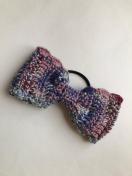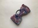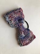 アクリル糸二本どりで大きめリボンを編んで、ヘアゴムを作りました。