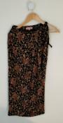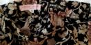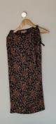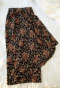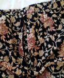 黒地にベージュや茶系の花柄がエスニックな雰囲気の前合わせが巻きスカート風のロングスカート