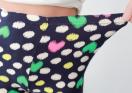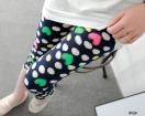 黒地にカラフルなハートや水玉がプリントされたレギンスパンツ。