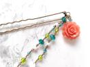 珊瑚色の薔薇に青緑や黄緑、真っ白のビーズを添えました。