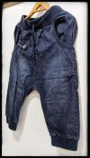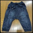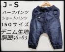 デニム生地、サイズは150サイズ、身長145から155、胴囲56から63と記載あります。