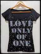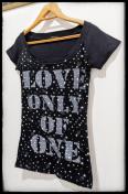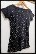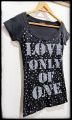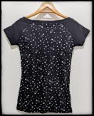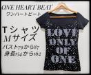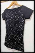 色は黒・アルファベットのプリントと星柄、サイズはMサイズ、バスト79から87、身長154から162と記載あります。