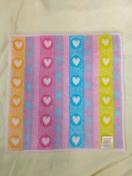 ピンクにカラフルなハート柄の可愛いミニタオルです。