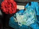 ゴージャスな大輪のパッカーアップリケは海中を揺らめく珊瑚を、スワロフスキー・クリスタルの輝きは輝く砂浜を表現。