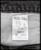 色は黒・デニム生地、サイズはウエスト64cm、ヒップ91cmと記載あります。