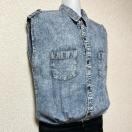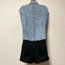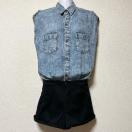 ノースリーブのダンガリーデニムのシャツにブラックのショートパンツを合わせた様な異素材コンビオールインワン