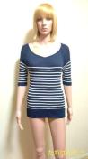 [商品情報] 襟元ラグランの開きが綺麗なマルチBDのの薄手ニットです。 ブランド:OEILLER 色:微光沢ネイビー×白 サイズ:M 平置き⇒衿から衿幅28cm、胸元幅37cm、総丈60〜63cm、袖丈36cm、裾幅35p 素材:レーヨン/ナイロン ストレッチ:あり 裏生地:なし 他:新品タグ付きです。