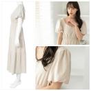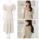 丸みのあるパフスリーブと、ふんわり広がるティアードシルエットがフェミニンな雰囲気を演出します