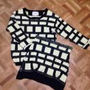 少し弛みを加えた立体的なジャカードニットをあえて裏使いしたユニークなチェック柄プルオーバーとスカート。