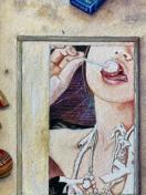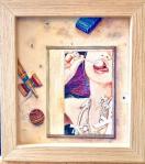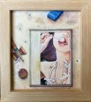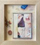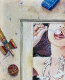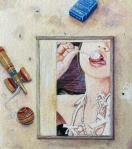 昔描いた油絵を水彩画チックに変えて、それをモチーフに、古びたパネルの上に置き、けん玉や煙草を適度にばら撒いて描きました。この絵もパネルもけん玉も地べたも現存していないので、殆ど想像です。以前描いた新垣結衣さんの構想と同じ感じです。